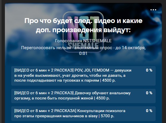 Лапочки 💖 Завершилось голосование по финансам из банка. В результате, победил вариант: [ВИДЕО от 6 мин + 1 РАССКАЗ + 1 ТРАКТАТ] Фемдом-сисси-тренинг – девушки страпонами феминизируют, доводят до оргазма и отдают мужчинам | Трактат на тему появления жанра БДСМ и влечения к подобному | 4500 р. Из банка списывается 4500 рублей, а на вышеуказанную тему позднее выйдет общедоступный ролик. Однако сперва появится VIP-лот (приватный sisys-трейнер …