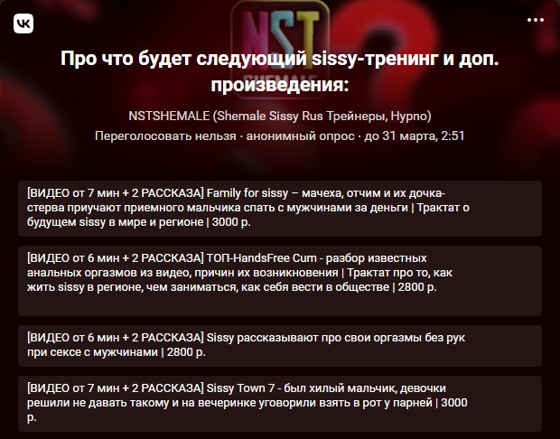 NstShemale – Сисси-Трейнеры, Гипноз, Мотивация на Русском 🔒 Официальный сайт | Сисси-мотивация (sissy trainers, hypno, lesson, tranny made), истории, уроки, гипноз. Русскоязычное сообщество для shemale, tranny.