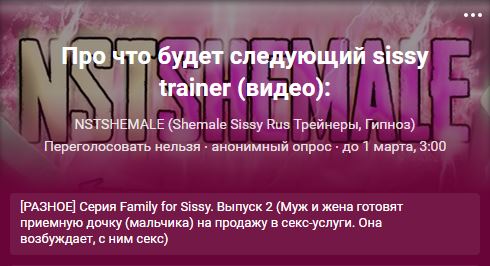 Лапочки 💖 Ночью завершился 2 этап голосования по выбору темы следующего сисси-трейнинга, который будет идти 9 минут (длина также выбиралась на опросе). В итоге, с отрывом всего в 3,18% победил вариант: “[РАЗНОЕ] Серия Family for Sissy. Выпуск 2 (муж и жена готовят приемную дочку (мальчика) на продажу в секс-услуги. Она возбуждает, с ним секс)”. Из банка списывается 1 800 рублей. А на вышеуказанную тему через несколько …
