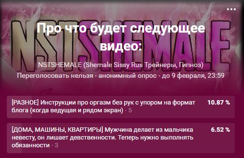 Лапочки 💖 Завершилось голосование по выбору темы следующего сисси-тренинга на русском. В результате опроса победил вариант: “[РАЗНОЕ] Инструкции про оргазм без рук с упором на формат блога (когда ведущая и рядом экран)”.  Выиграл он с результатом 16.62%, опередив предыдущий пункт всего на 0,88% (на 3 голоса). Данный ролик будет в слегка обновленном формате sissy-реакций/разборов. Из банка  списывается 1 тыс. рублей, а через 3-5 дней появится …