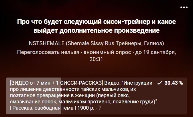 Лапочки 💖 Завершилось голосование по финансам из банка сообщества. В результате опроса, комьюнити выбрало следующие пункты: Видео: длина 7 минут и тема “Инструкции про лишение девственности тайских мальчиков, их поэтапное превращение в женщин (первый секс, смазывание попок, мальчикам противно, появление груди)”; Доп. произведение: со свободным содержимым. Из банка списывается 1900 рублей, а вскоре, выйдет сисси-трейнер и порно-история (текст) на вышеуказанные темы. 🏦 В банке сообщества: 8138 / 1000 р.
