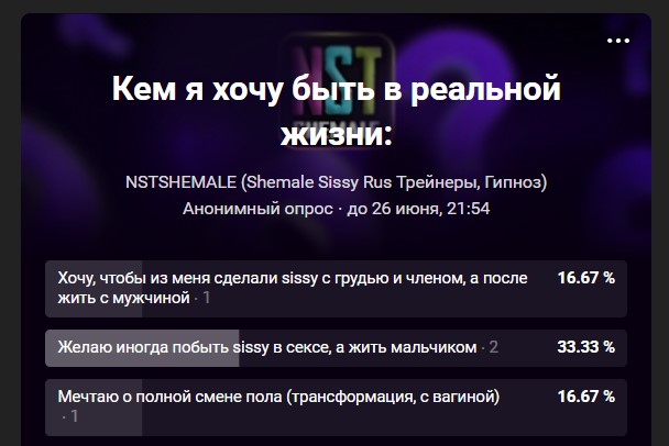 Лапочки  Пока выпускается новый ВИП-лот и сисси-трейнер, а также рассказ (он появится уже на днях), проведем тематический опрос на тему взглядов в сторону гендерной принадлежности: Тема: кем хотят быть лапочки, смотрящие сисси-порно, увлекающиеся транс-идеологией и т. д. 💟 Результаты 💟 Форма из ВК Перейти для голосования во ВКонтакте