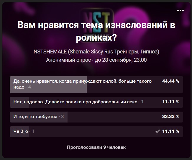 Лапочки 💖 Письмо пришло на почту сайта, от зрителя. В нем следующий текст: “Вам самим тема изнасилования не надоела? Я думал, сисси добровольно желают стать женщиной и заиметь возможность заиметь детей”.   Лично мне, очень нравится жанр принуждения sissy. Про добровольный секс также есть выпуски и еще будут. Что касается жизни, то полностью согласна. Но, давайте повторно проведем опрос на данную тему. И далее предложение (оно …