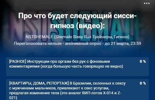 Лапочки 💖  На днях у нас вышло свежее видео размещено парой сообщений назад. Делался сисси-трейнер дольше обычного, причины чего описывались в блоках новостей. На фоне этого давайте сразу перейдем к следующему голосованию, так как в банке сообщества сумма превысила 1 тыс. р. А это значит, что пришло время для опроса.