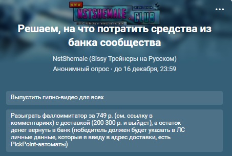 Лапочки, привет 💖 Благодаря поддержке покровителей, финансировавших ролики и бравших VIP-лоты, в банке сообщества набралось 1000 р. (в банк попадает 10% от всех поддержек). Эти финансы дарятся комьюнити. То есть вам 💝 Пришло время решить, на что пойдет сумма в 1000 р. в этот раз. Голосуем 💖💖💖 Форма голосования из ВК:  Данный фаллоимитатор будет разыгрываться при победе соответствующего пункта: ССЫЛКА (может быть заменен на аналогичный по …